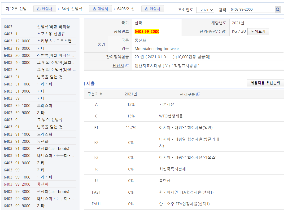 그리고 같은 등산화인데 세율이 약간 다른것 확인 되시나요? 이렇게 한가지 품목에도 다른 HS CODE 적용이 가능합니다.
