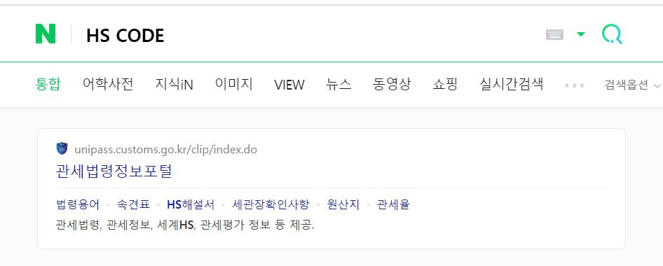 검색을 위해서 먼저 네X버에 HS CODE를 검색해 줍니다. 그럼 아래와 같은 화면이 나옵니다.