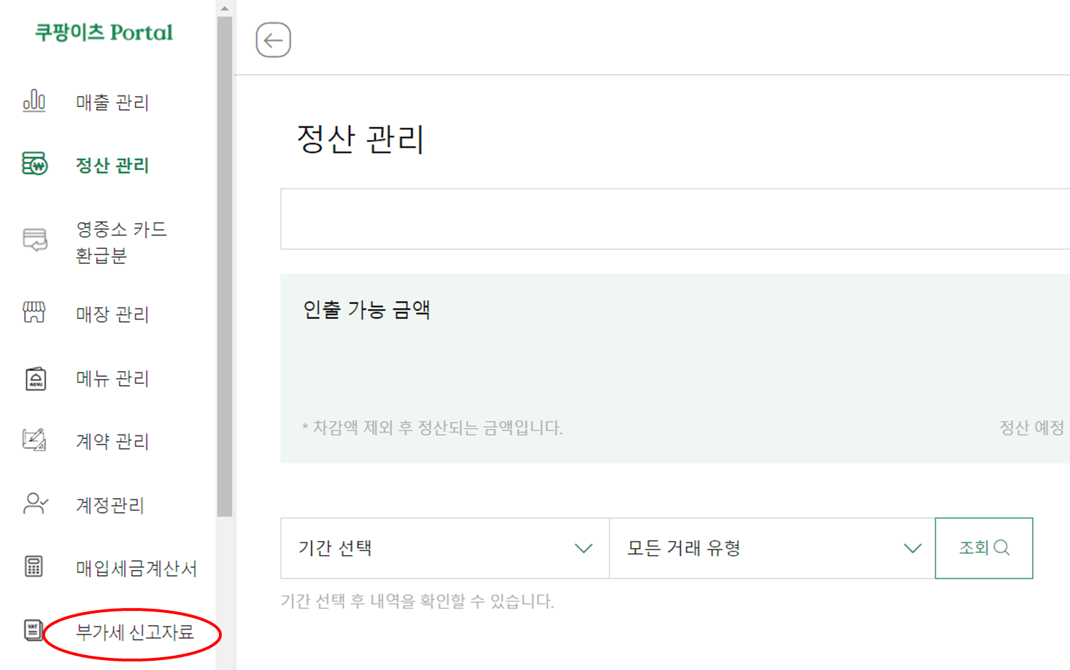 접속방법 : 쿠팡이츠 스토어검색 ->좌측 부가세 신고자료 클릭
