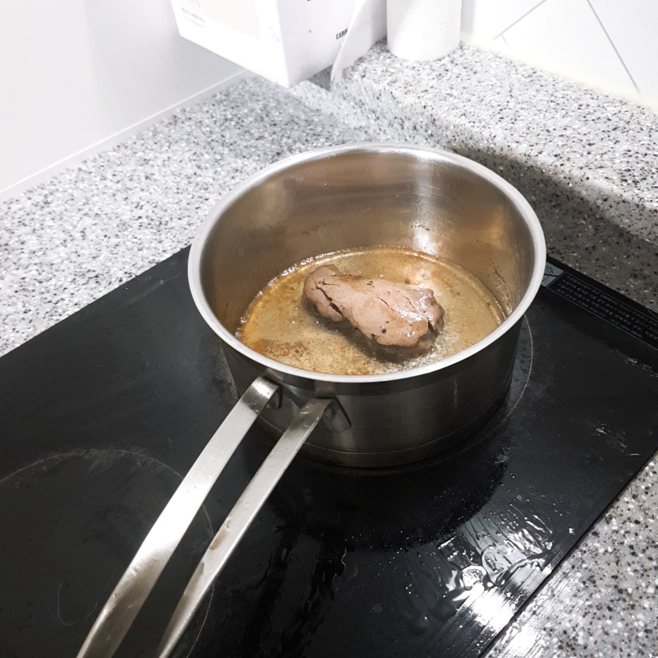 버터를 녹이고 나면 고기와 가니시를 넣고 고기는 똑같이 양면 30초씩 2번, 가니쉬는 익을때까지 구워주시면 되는데 이때는 숟가락으로 버터기름을 고기에 계속 끼얹어주어야 합니다.
