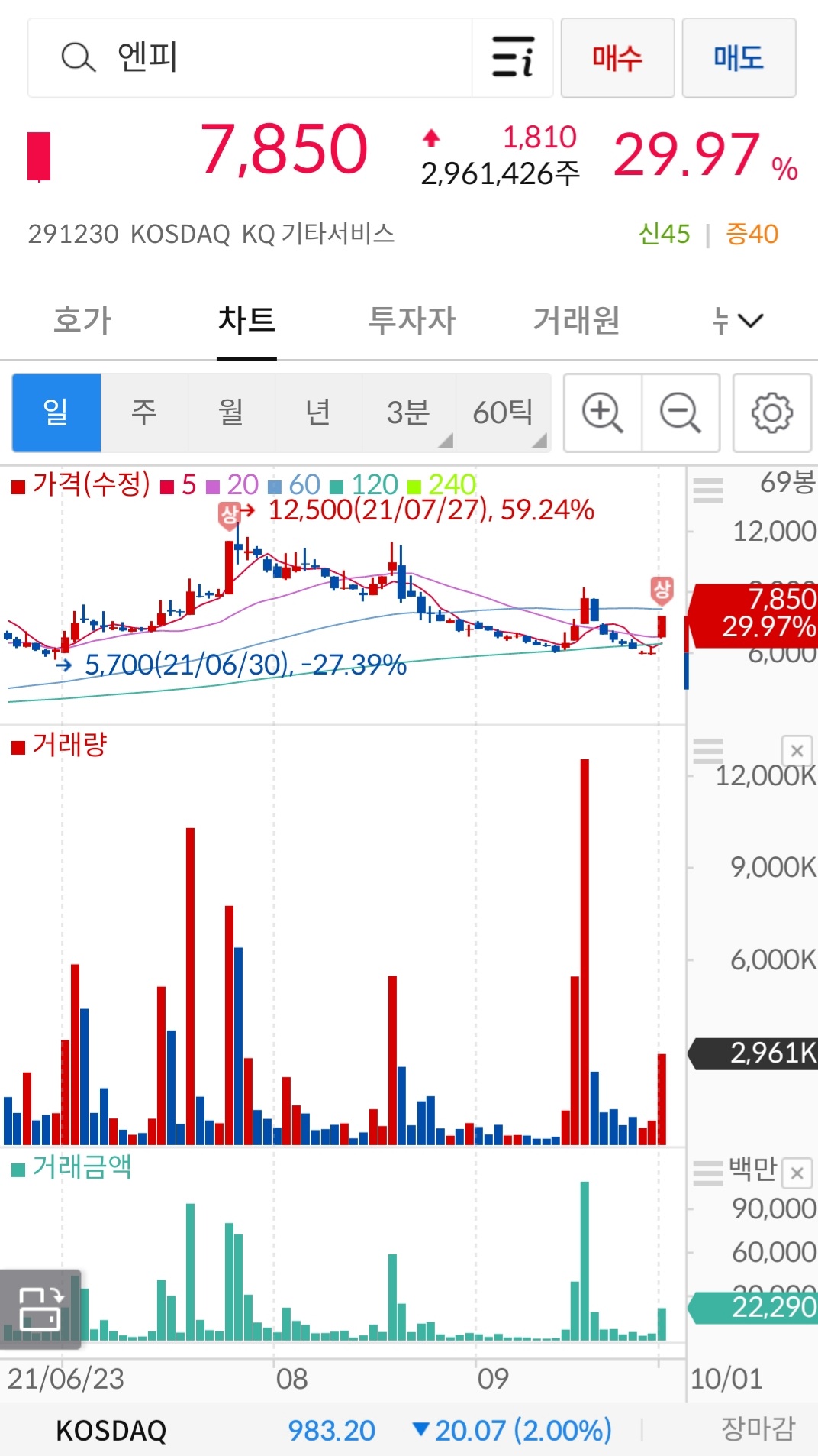 장시작과 거의 동시에 상한가 기록으로 거래대금은 220억정도 터졌으며 호가잔량이 많지 않아 연상을 가줄지는 좀 의문입니다.