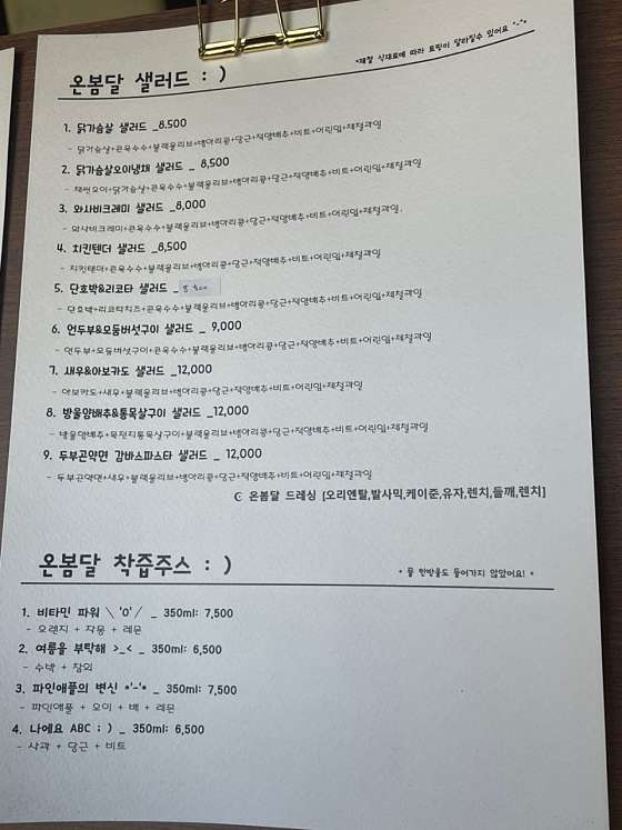 온봄달의 메뉴 입니다. 위 사진에는 없지만 가성비 좋은 샌드위치와 직접 만든 그릭 요거트도 있었는데 건강식 위주이다 보니 음료도 커피보단 건강음료가 주를 이루고 있었습니다.